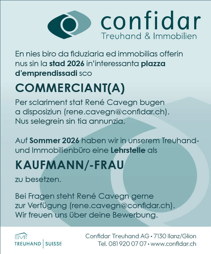 Auf Sommer 2026 haben wir eine Lehrstelle als Kaufmann/-frau zu besetzen. Wir freuen uns auf deine Bewerbung